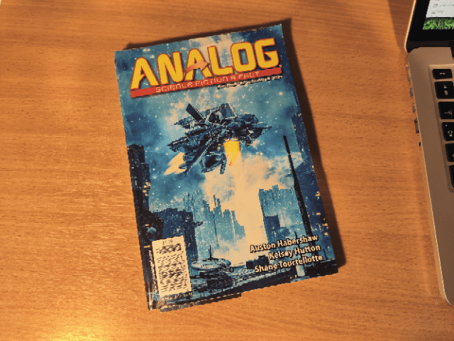 It’s always a delight to receive a new printed issue of Analog through the letterbox – but even more so when it includes a story of mine! Mostly I read e-versions of the various SF magazines I subscribe to but it’s a special treat to buy extra printed copies to give away to friends and family (whether they want one or not!)